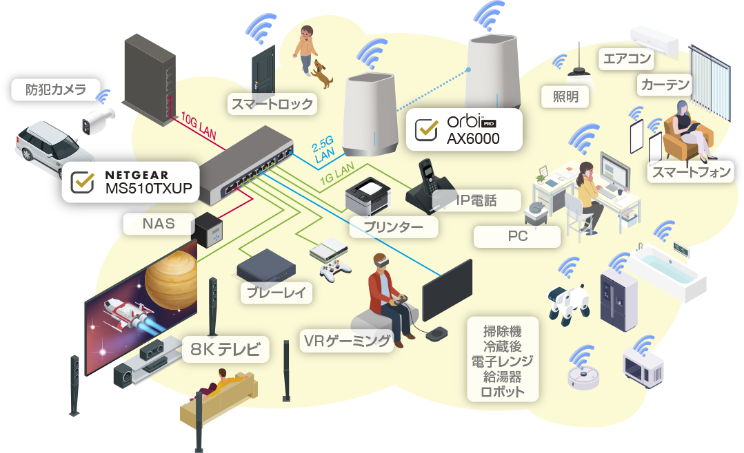 親が書斎で仕事をしている傍ら、子どもは部屋でゲームやストリーミング配信を楽しむ。いつの間にか各部屋同時に高速通信を行う場面が家庭にあふれています。ルーター付近だけでなく、全部屋で10G高速インターネット通信を利用するには、最新WiFi 6に対応したメッシュエクステンダーが最も簡単でお手頃な手段です。まずはここから、10Gホームネットワークの世界へ。