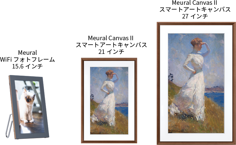 Meuralは3つのサイズをご用意しています。どのMeuralも、世界中のアートライブラリや、ご自身で撮影したお気に入りの写真を楽しむことができます。