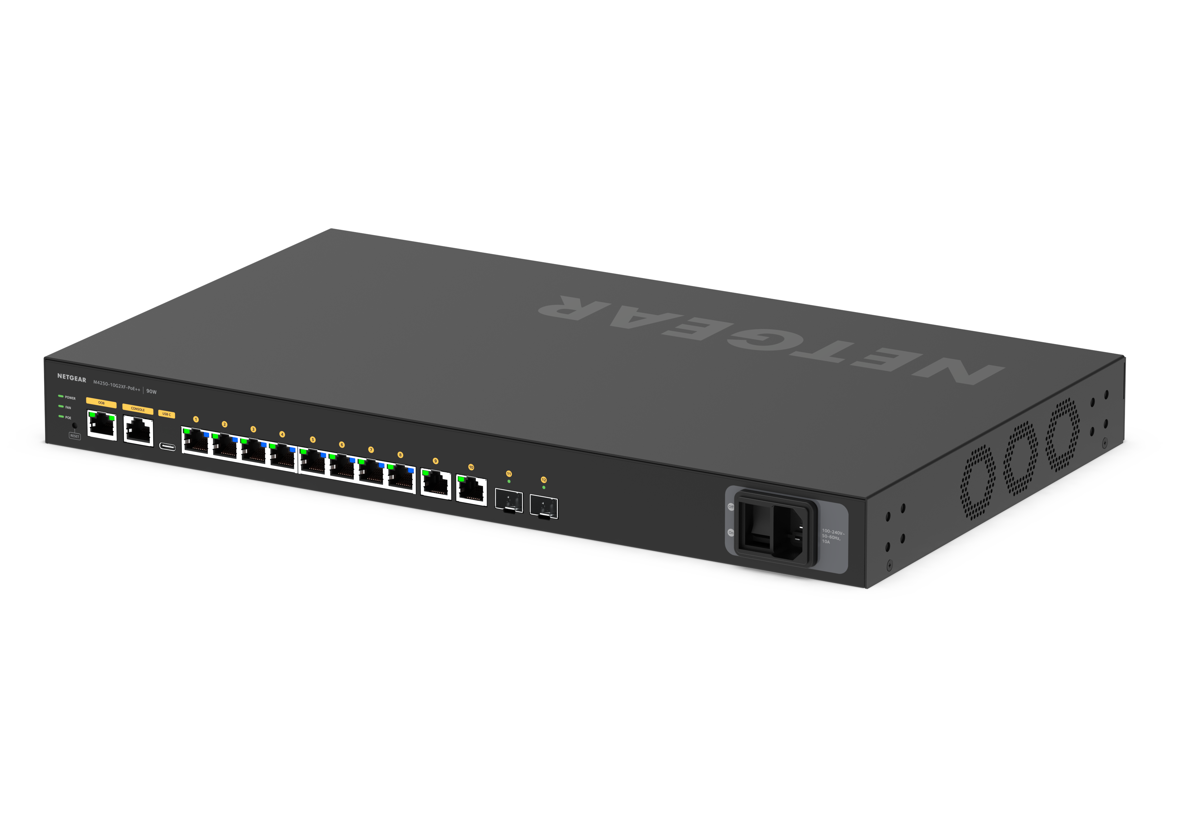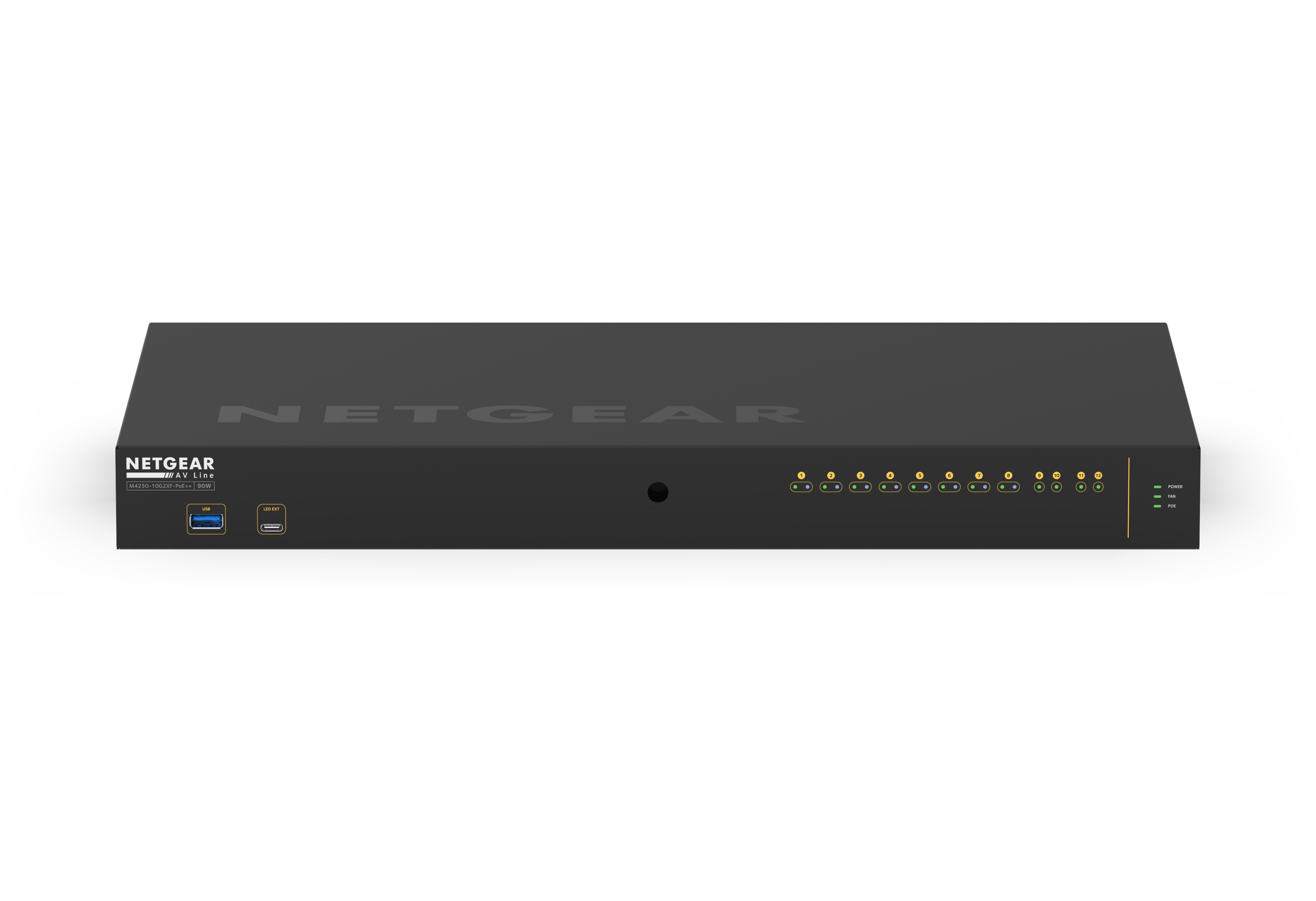 商品情報 【Ultra90 PoE++対応(720W) 1G×10 SFP+×2 フルマネージスイッチ】 メーカーサイトを見る M4250-10G2XF-PoE++ ギガ10ポート 10GSFP+ 2スロット Ultra90 PoE++対応(720W) フルマネージスイッチ ProAV IGMP Plus GSM4212UX ・ProAVシステムに最適化されたスイッチで、必要なポート数のモデルを選んでエンドポイントデバイスを接続すれば、あとはスイッチの電源を入れるだけ簡単にProAV環境を構築できます。 ・ギガビットポートを10個と10G SFP+スロットを2個搭載。 ・Ultra90 PoE++に対応しており、1ポートあたり90W、8ポート合計で720Wの電力を供給。 ・PIMルーティングなど設定が不要なプラグアンドプレイマルチキャスト用のためのIGMP+(IGMPプラス)をサポート。 ・【ライフタイムハードウェア保証】ネットギアのサポート窓口は365日年中無休で対応します。(購入後サポートの際には無償ユーザ登録が必要です)