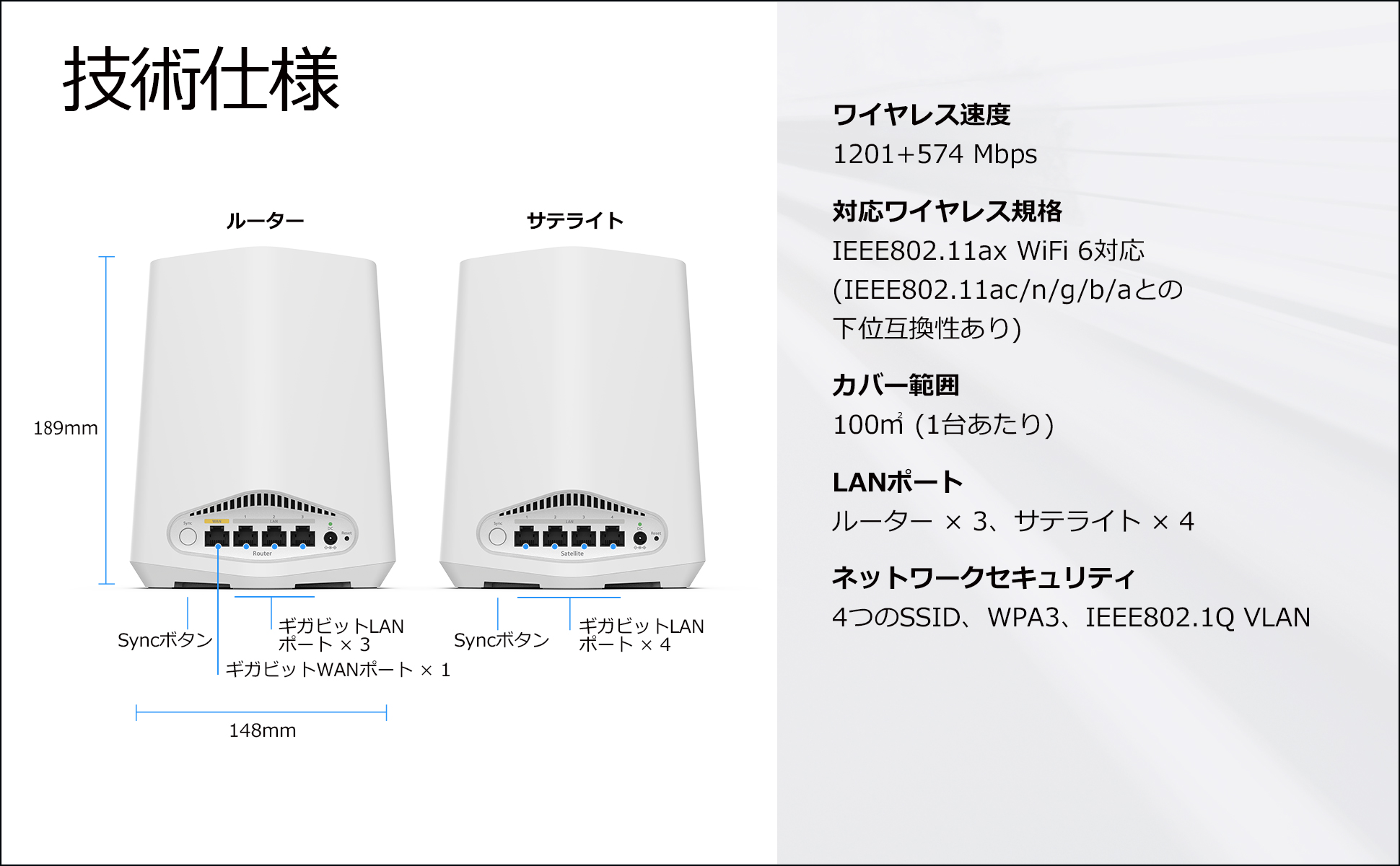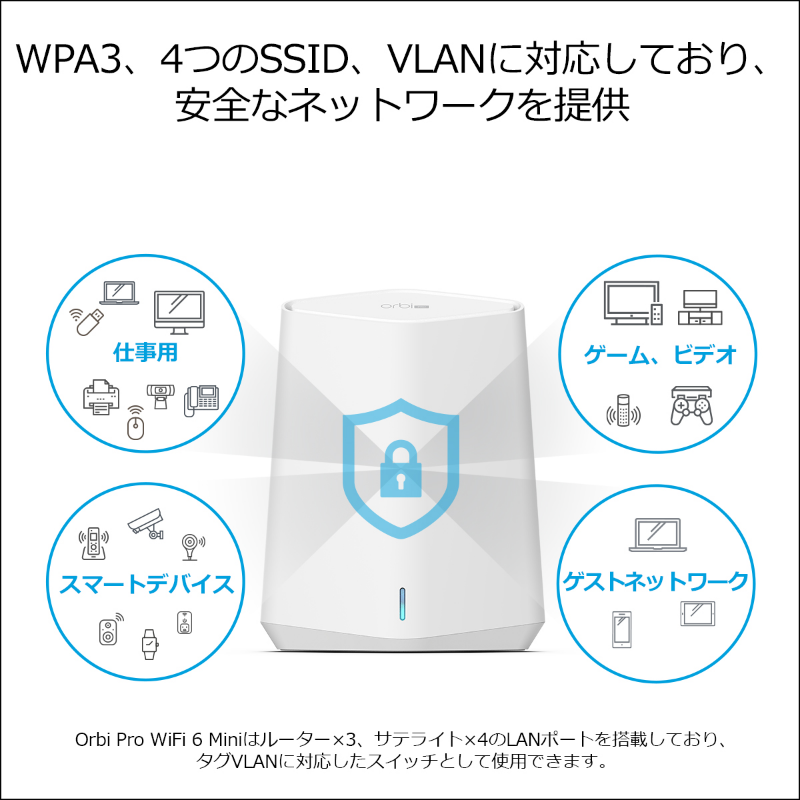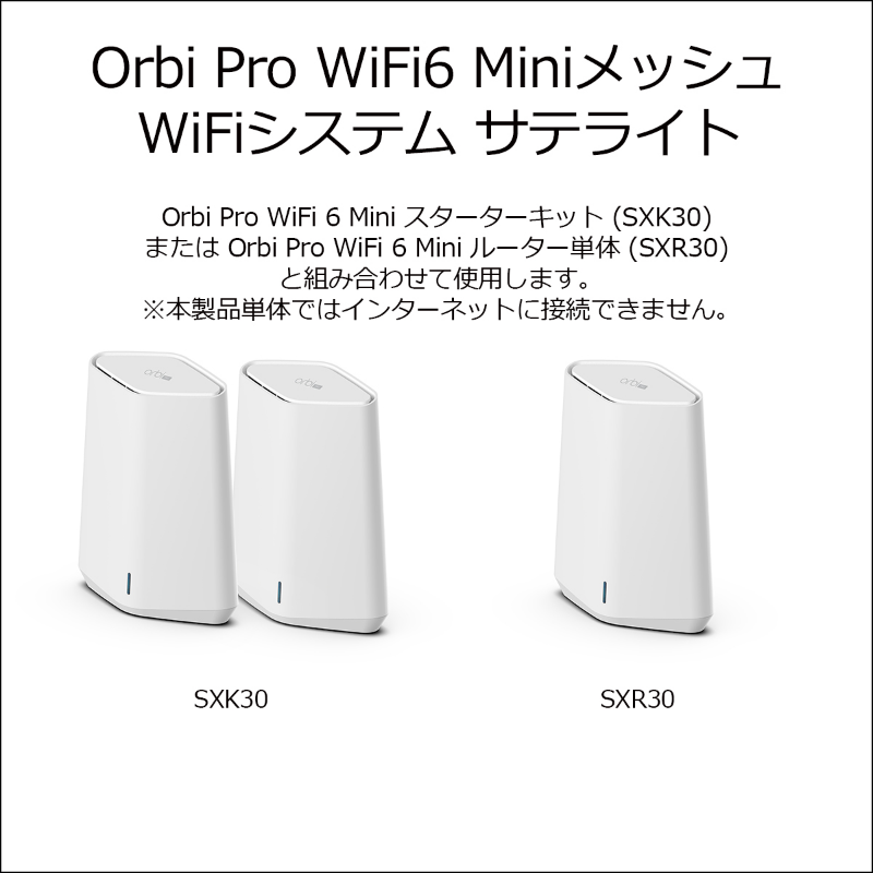 Orbi Pro WiFi 6 2台セット| SXK80-100JPS| ¥101,300(税込) AX1800 Orbi Pro WiFi 6 Mini 2台セット| SXK30-100JPS| ¥47,200(税込) Orbi Pro WiFi 6 追加サテライト| SXS80-100JPS| ¥79,900(税込) AX1800 Orbi Pro WiFi 6 Mini 追加用サテライト| SXS30-100JPS| ¥25,100(税込)