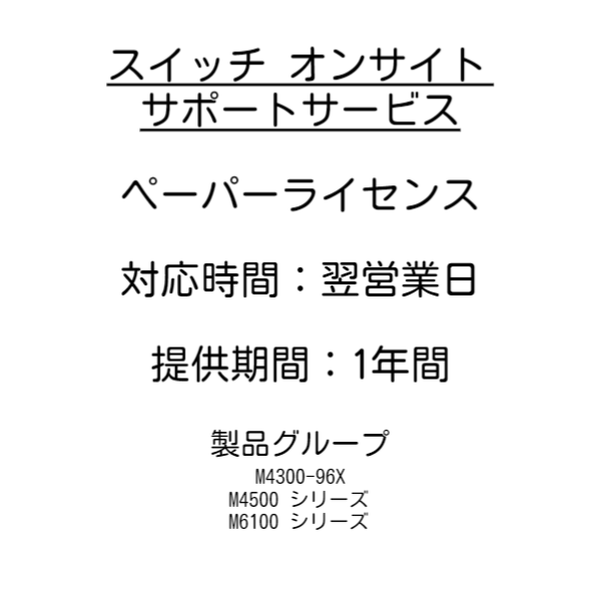 商品情報 【オンサイト 翌日(L3マネージスイッチ) 6年目/7年目 1年間 ペーパーライセンス(提供範囲:日本全国)】 サポートの詳細はこちらをご確認ください。 https://www.jp.netgear.com/Supportinfo/about-fbs/fbs-price.aspx また、ペーパーライセンスを紛失した際は下記カスタマサポート窓口へお問い合わせください。 https://www.netgear.jp/supportInfo/Contact/