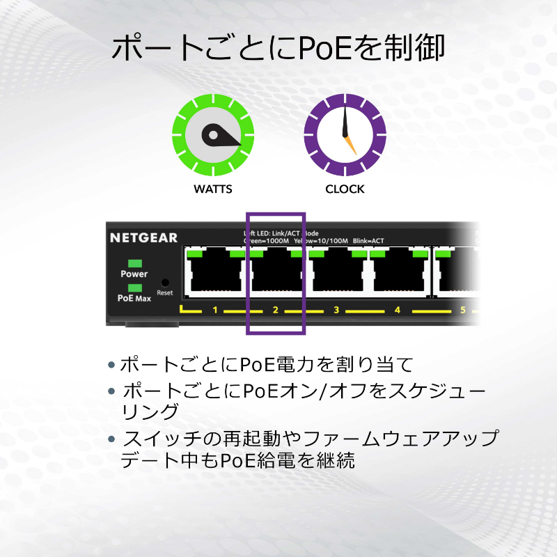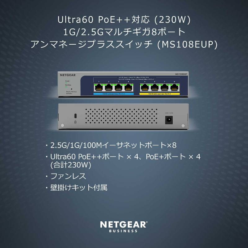 商品情報 【Ultra60 PoE++対応 (230W) 1G/2.5Gマルチギガ8ポートアンマネージプラススイッチ】 メーカーサイトを見る ・1G/2.5Gマルチギガポートを8基搭載したアンマネージプラススイッチ。既存のCat5e/Cat6ケーブルを使用して2.5Gの高速スピードを実現 ・IEEE 802.3bt Ultra60 PoE++×4(1ポートあたり60W)、IEEE802.3at PoE+×4(1ポートあたり30W)、スイッチ全体で230Wの電力を供給 ・2.5Gポート搭載のWiFi 6対応アクセスポイントや高画質IPカメラの接続に最適 ・VLANやQoS、リンクアグリゲーション、IGMPスヌーピング、ジャンボフレームなどの基本機能に対応 ・ループ防止対応 ・Webベースの日本語管理画面 ・壁掛けキット付属 ・リミテッドライフタイムハードウェア保証 https://www.netgear.com/jp/supportinfo/about-warranty/ ************************************************* 保守詳細 クイックデリバリー翌営業日 【PRRND11-100JPS】 全製品(一部製品を除く)用クイックデリバリー翌日1年 (提供範囲:日本全国) スイッチ オンサイトサポート 翌営業日、1年 【PMPND11-100JPS】 プラス/クリック/スマート/L2マネージ用オンサイト翌日 1年 (提供範囲:日本全国) オンコールサポート 1年 【PMB0312P-100JPS】 (提供範囲:日本全国) ************************************************