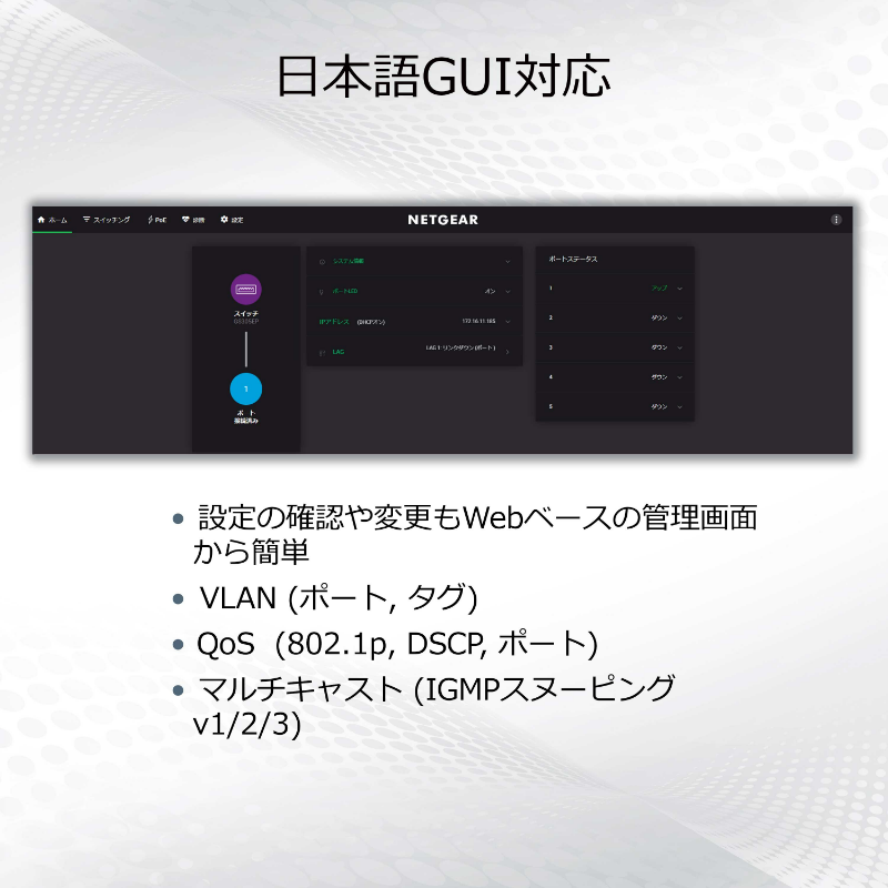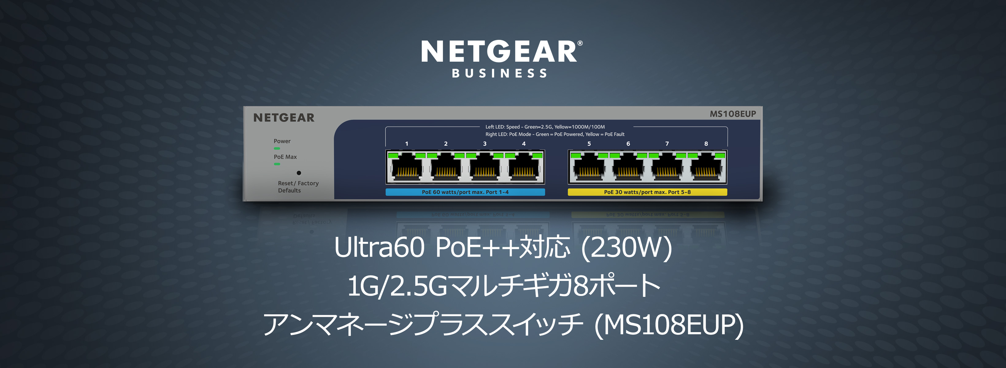 10G/マルチギガ8ポート アンマネージスイッチ| XS508M-100AJS| ¥92,400(税込) XS708E| XS708E-200AJS| ¥115,500(税込) Ultra60 PoE++対応 (230W) 1G/2.5Gマルチギガ8ポート アンマネージプラススイッチ| MS108EUP-100JPS| ¥81,500(税込)