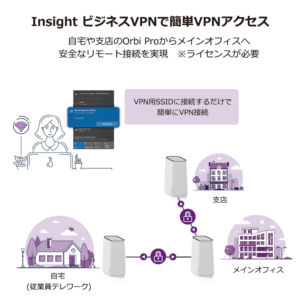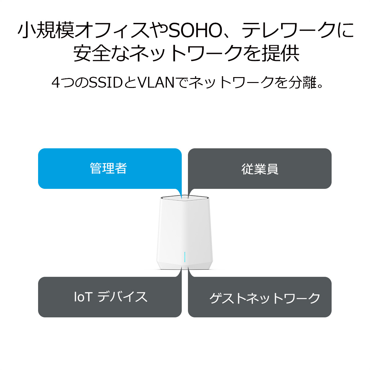 商品情報 【Orbi Pro WiFi 6 AX5400 トライバンド メッシュWiFiシステム スターターキット 2台セット(SXK50)】 メーカーサイトを見る 【法人向け メッシュWiFiルーター+サテライト】オフィスや店舗全体を1つのSSIDでカバーするWiFi 6対応ビジネス用トライバンドメッシュWiFiシステム。 【移動しても通信が途切れない】ルーター1台とサテライト1台の合計2台セットで、AX5400の高速WiFiを464平方メートルの範囲に提供。 【トライバンドメッシュWiFi】ルーターとサテライト間は中継専用バンド2,402Mbps (5GHz) で接続し、PCやタブレットなどの子機接続用には独立した2,402Mbps (5GHz) と574Mbps (2.4GHz) を用意しているため、端末の通信帯域を減らすことなく、無線だけで安定した高速WiFi接続環境を構築できる。 【チェーン店、SOHO】ケーブルの 敷設が難しかったり、レイアウト変更が多いSOHOやチェーン店、クリニックなどの小規模ビジネスに最適。 【テレワークにも】最新の WiFi データセキュリティ規格であるWPA3と4つのSSID、VLANに対応しており、安全なネットワークを提供すると同時に、家族の接続を分離することができるため、テレワークにも最適。 【法人向け】Insightリモート管理ソリューションを使用すると、設定変更やトラブル対応に時間やコストをかけることなく、モバイルデバイス上のInsightアプリを使用して、どこからでもネットワークを管理できる。 【VPNサービス】別売りのInsightビジネスVPNライセンスにより、メインオフィスにあるOrbi Proとご家庭や支店にあるOrbi Proとの間で、安全なVPNトンネルを構築し、暗号化された高セキュリティのリモート接続を可能にする。 【LANポート】ルーター × 3, サテライト × 4のLANポートを搭載しているため、スイッチングハブとしての使用も可能、今までLANケーブルが届かなかった場所でも、プリンターやIP電話などの有線デバイスを利用することができる。 https://www.netgear.com/jp/supportinfo/about-warranty/ ************************************************* 製品保証 5年保証(購入から30日以内にユーザー登録を済ませておくことが必須) ************************************************