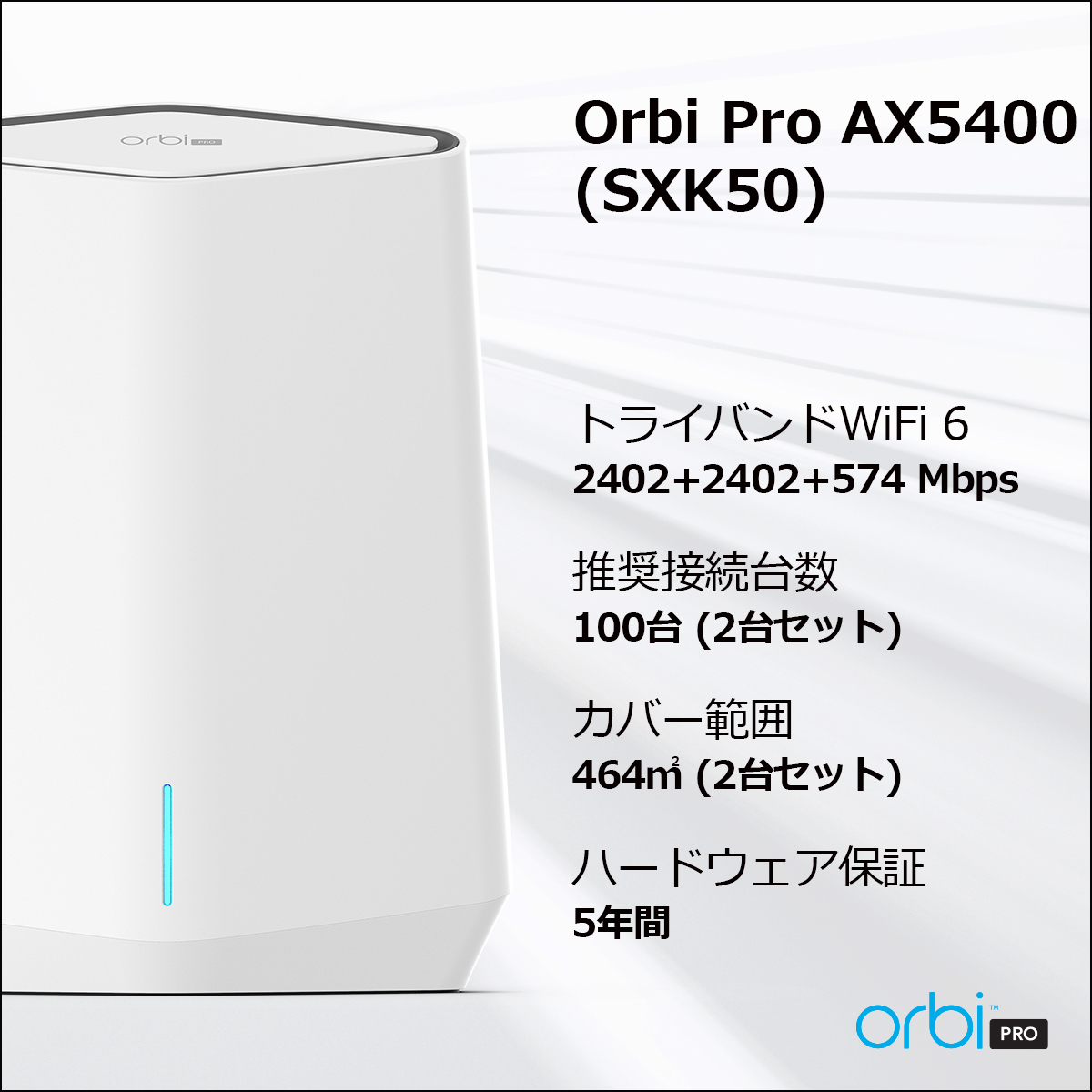 Orbi Pro WiFi 6 2台セット| SXK80-100JPS| ¥101,300(税込) AX5400 Orbi Pro WiFi 6 2台セット| SXK50-100APS| ¥82,800(税込) AX1800 Orbi Pro WiFi 6 Mini 2台セット| SXK30-100JPS| ¥47,200(税込) AX6000 Orbi Pro WiFi 6 ルーター| SXR80-100JPS| ¥83,400(税込) AX5400 Orbi Pro WiFi 6 ルーター| SXR50-100APS| ¥47,600(税込) AX1800 Orbi Pro WiFi 6 Mini ルーター| SXR30-100JPS| ¥26,800(税込) Orbi Pro WiFi 6 追加サテライト| SXS80-100JPS| ¥79,900(税込) AX5400 Orbi Pro WiFi6 追加サテライト| SXS50-100APS| ¥46,000(税込) AX1800 Orbi Pro WiFi 6 Mini 追加用サテライト| SXS30-100JPS| ¥25,100(税込)