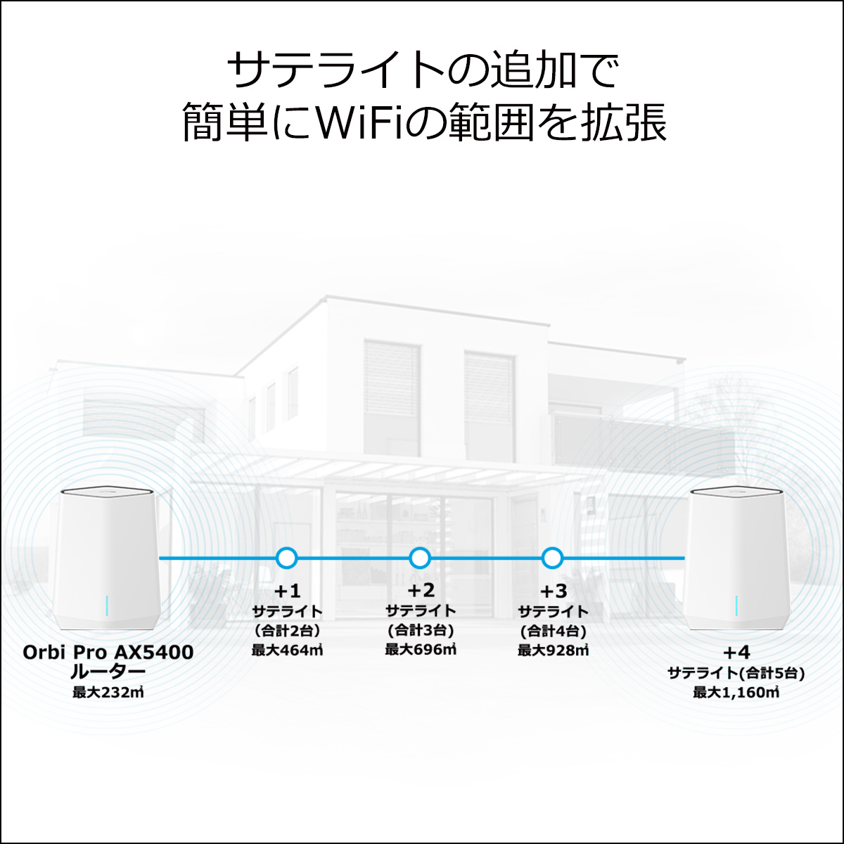 Orbi Pro WiFi 6 2台セット| SXK80-100JPS| ¥101,300(税込) AX5400 Orbi Pro WiFi 6 2台セット| SXK50-100APS| ¥82,800(税込) AX1800 Orbi Pro WiFi 6 Mini 2台セット| SXK30-100JPS| ¥47,200(税込) AX6000 Orbi Pro WiFi 6 ルーター| SXR80-100JPS| ¥83,400(税込) AX5400 Orbi Pro WiFi 6 ルーター| SXR50-100APS| ¥47,600(税込) AX1800 Orbi Pro WiFi 6 Mini ルーター| SXR30-100JPS| ¥26,800(税込) Orbi Pro WiFi 6 追加サテライト| SXS80-100JPS| ¥79,900(税込) AX5400 Orbi Pro WiFi6 追加サテライト| SXS50-100APS| ¥46,000(税込) AX1800 Orbi Pro WiFi 6 Mini 追加用サテライト| SXS30-100JPS| ¥25,100(税込)
