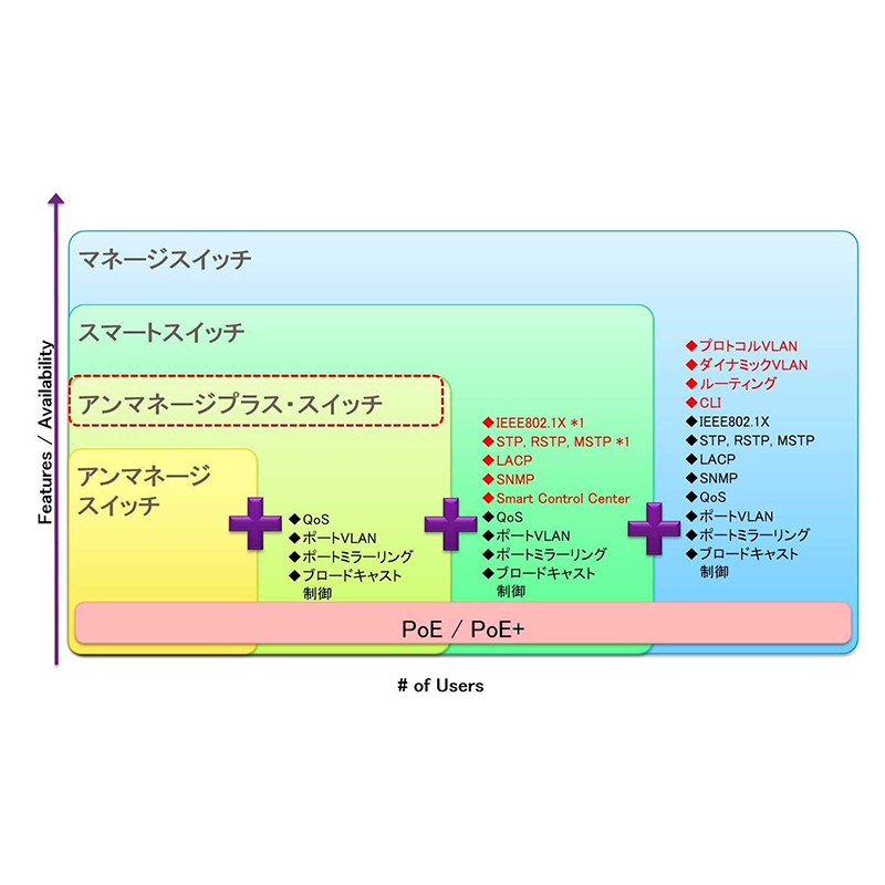 商品情報 【5PT GIGE SMART MANAGED PLUS SWCH】 メーカーサイトを見る ・ギガビット(10/100/1000Mbps)5ポート ビジネス向けのレイヤー2アンマネージプラス・スイッチ。 ・騒音源となる冷却ファンが不要で放熱性能の高い金属筐体。手のひらサイズのコンパクト設計。電源アダプターもコンパクト。 ・すべてのポートが同時にギガビット送受信してもパフォーマンスが劣化しないノンブロッキング設計。 ・VLAN(ポート、タグ)、QoS(802.1p, DSCP, ポート)、マルチキャスト(IGMPスヌーピングv1/2/3)。 ・サイズ9,000バイトのジャンボフレームに対応し、データ転送が効率的に行える。 ・省電力設計:Energy Efficient Ethernet (802.3az),未使用ポートの電力カット,ケーブルが短いポートの電力カット。 ・ウェブブラウザーまたはWindows用の専用ツール(無償)で設定・管理運用が可能。 ・ポートミラーリング対応。他のポートの送受信データを別のポートへ転送し、ネットワークのトラブルシューティングが手軽に行える。 ・リミテッドライフタイム保証(電源アダプターは2年保証) ************************************************* 保守詳細 クイックデリバリー2時間 【PRR2H11-100JPS】 全製品(一部製品を除く)用クイックデリバリー翌日1年 (提供範囲:東京23区、横浜市、川崎市、名古屋市、大阪市) クイックデリバリー翌営業日 【PRRND11-100JPS】 全製品(一部製品を除く)用クイックデリバリー翌日1年 (提供範囲:日本全国) スイッチ オンサイトサポート 4時間、1年 【PMP4H11-100JPS】 プラス/クリック/スマート/L2マネージ用オンサイト4時間 1年 (提供範囲:東京23区、横浜市、川崎市、名古屋市、大阪市) スイッチ オンサイトサポート 4時間、5年 【PMP4H51-100JPS】 プラス/クリック/スマート/L2マネージ用オンサイト4時間 5年 (提供範囲:東京23区、横浜市、川崎市、名古屋市、大阪市) スイッチ オンサイトサポート 翌営業日、1年 【PMPND11-100JPS】 プラス/クリック/スマート/L2マネージ用オンサイト翌日 1年 (提供範囲:日本全国) スイッチ オンサイトサポート 翌営業日、5年 【PMPND51-100JPS】 プラス/クリック/スマート/L2マネージ用オンサイト翌日 5年 (提供範囲:日本全国) *************************************************