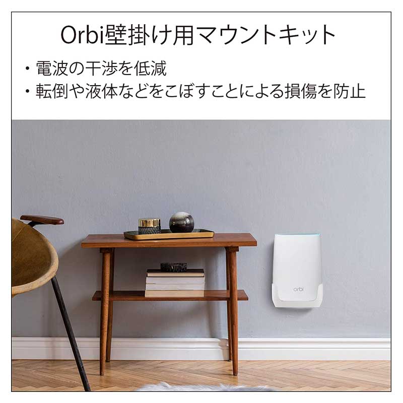 商品情報 【WiFiシステム Orbiシリーズ 壁掛け用マウントキット】 メーカーサイトはこちら Orbi壁掛け用マウントキットは、Orbiシリーズのルーター、サテライトに対応しており、Orbiを垂直な壁面に簡単に取り付けることができます。 シンプルなデザインで、家の中をすっきりさせることができます。 【Orbiを壁掛け】Orbiを垂直な壁面に取り付け可能 【壁掛けのメリット】高い位置に取り付けることで電波の干渉を低減、Orbi本体を倒したり、飲み物などをこぼしたりすることによる損傷を防止 【シンプルデザイン】インテリアの邪魔にならないコンパクトでシンプルなデザイン 【対応機種】RBR20, RBS20, RBK20, RBK23, RBS50, RBK50, RBK53, RBK852, RBK853, RBK752, RBK753, RBS750, RBK352, RBK353, RBS350 【安心の日本語サポートと1年保証】ネットギアのサポート窓口は365日年中無休で対応(購入から30日以内にユーザー登録を済ませておくことが必須) 【同梱内容】壁掛け用カバー、壁掛け用ブラケット、クレードル、壁面取り付け用アンカー、ネジ、インストールガイド 【本体寸法】175 x 127 x 124mm 【梱包重量】440g