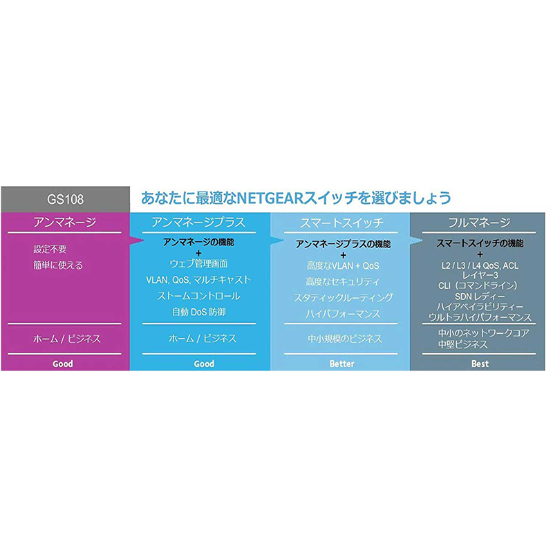 ギガビット8ポート アンマネージスイッチ| GS108-400JPS| ¥10,100(税込) PoE+対応 (123W) ギガビット8ポート アンマネージスイッチ| GS108PP-100AJS| ¥25,900(税込) ギガビット8ポート アンマネージプラススイッチ| GS108E-300JPS| ¥13,000(税込) PoE対応 (53W) ギガビット8ポート アンマネージプラススイッチ| GS108PE-300JPS| ¥16,700(税込) GS108T| GS108T-300JPS| ¥17,400(税込)