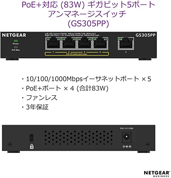 ギガビット5ポート アンマネージスイッチ| GS305-300JPS| ¥3,430(税込) POE+対応 (63W) ギガビット5ポート アンマネージスイッチ| GS305P-200JPS| ¥10,600(税込) POE+対応 (83W) ギガビット5ポート アンマネージスイッチ| GS305PP-100JPS| ¥15,000(税込) ギガビット5ポート アンマネージプラススイッチ| GS305E-100JPS| ¥4,450(税込) POE+対応 (63W) ギガビット5ポート アンマネージプラススイッチ| GS305EP-100JPS| ¥11,700(税込) POE+対応 (120W) ギガビット5ポート アンマネージプラススイッチ| GS305EPP-100JPS| ¥16,500(税込)